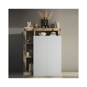 Mobile da ingresso bianco lucido/pero con 4 ripiani interni e 4 vani a giorno. L'accostamento bianco con il colore pero lo rendono un mobile raffinato che si adatta ad ambienti giorno moderni.