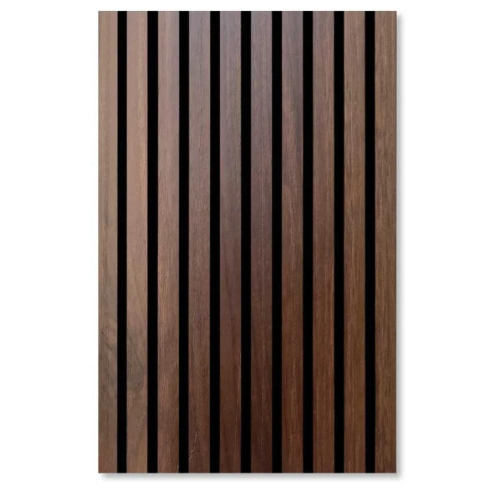 Rivestimento murale con doghe in MDF effetto legno 3D su fondo in feltro fonoassorbente;