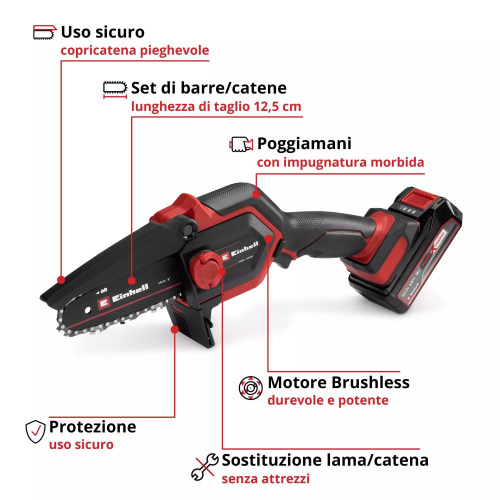La motosega da potatura a batteria GE-PS 18/15 Li Bag Kit di Einhell è un pratico aiutante per la potatura e la sagomatura di alberi e arbusti, nonché per la sminuzzatura di sfalci verdi e il taglio di legname più piccolo e squadrato. La sega compatta fa parte della famiglia Power X-Change di Einhell e può essere combinata con tutte le batterie e i caricabatteria della famiglia. L'apparecchio è alimentato da un motore Brushless di Einhell. Il motore senza spazzole offre più potenza e una maggiore autonomia di lavoro rispetto ai tradizionali motori a spazzole a carboncino. Dopo la registrazione online, il motore è coperto da una garanzia di 10 anni. Con una lunghezza della lama di 15,8 cm e una lunghezza di taglio di 12,5 cm, questa piccola e leggera motosega a batteria è ideale per un uso versatile in giardino. Il motore ad alta efficienza garantisce vibrazioni minime e una velocità della catena fino a 4,8 m/s. La sega viene fornita con un set di lame e catene di alta qualità per elevate prestazioni di taglio e i migliori risultati di lavoro. Per una facile manutenzione, la barra e la catena possono essere sostituite facilmente e senza attrezzi. La sega è dotata di una protezione per le mani e di un copricatena pieghevole che ne rendono l'uso sicuro e versatile. Il pratico attrezzo da giardino è comodo da tenere in mano grazie all'impugnatura sottile, alle speciali superfici Softgrip e al poggiamani incorporato per l'uso ambidestro. Consegnata con copertura per riporre in modo sicuro la piccola motosega. Sono inclusi anche un dosatore per l'oliatura manuale della catena e una chiave a brugola per il tensionamento della catena. Il set comprende anche una batteria Power X-Change da 2,5 Ah, un caricabatteria, una catena di ricambio per la sostituzione rapida della catena e la Einhell Bag 45/29.